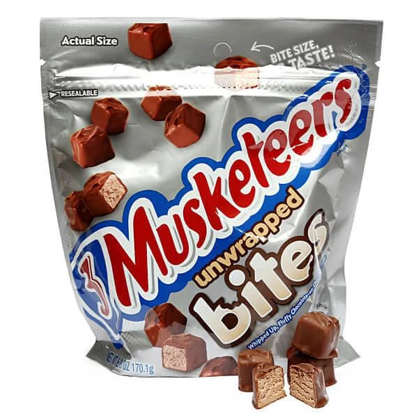 Resealable bag contains 6 ounces of 3 Musketeers Bites Candy.