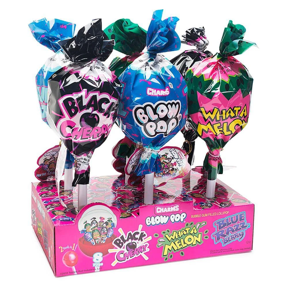 DISCLAIMER: Every display contains an assortment of Giant Blow Pops Containers, but is not guaranteed to include every color available. Color assortment may vary from photographs. NO REFUNDS for COLOR variance.