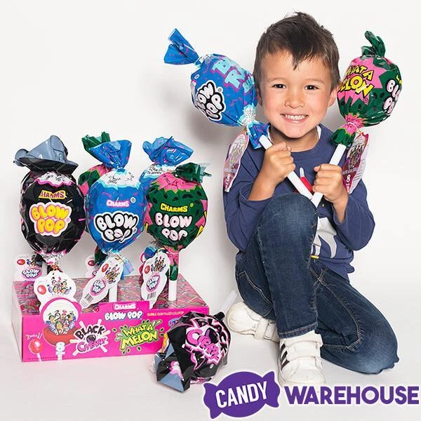 Maintain your reputation for being the hippest parent in the ‘hood by procuring this epic 6-piece display of Charms Giant Blow Pops – Fun Flavors for your kid’s party. Little people go nuts for these gargantuan Giant Blow Pops containers that lead to enormous laughs and massive amounts of fun. Each of the six prodigious plastic pops contains eight bubble gum filled lollipops — enough to make 48 excited kids hugely happy. Luscious fruit flavors lurking inside the regular-size Blow Pops lollipops include Blue Razz Berry, Black Cherry, and What a Melon. Each sucker delivers a mighty sweet hard candy shell encasing a Charms gum center for hours of bubblicious fun. Count on Candy Warehouse to carry all the classic Charms Blow Pops you love most in single-flavor and taste-bud-tantalizing assortment boxes.