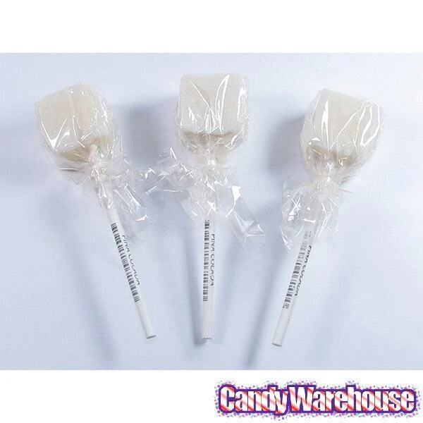 Frothy pina colada flavor bursts from these delicious cube lollipops featuring a white color. Way more yummy than spheres, prisms, or cylinders, no calculus is required to determine that the surface area of these candy cubes is sweet geometry for your mouth!