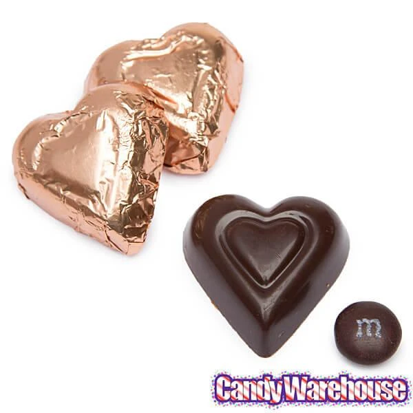 Box contains 5 pounds of Bronze Dark Chocolate Hearts Candy.