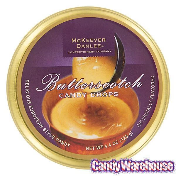 Gourmet hard candy bon bons packed in elegant tins featuring a delicious butterscotch flavor.