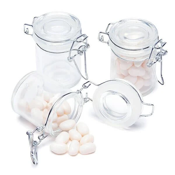 Adorable favor jars featuring metal swing top locking mechanisms and white rubber gaskets to seal in freshness. The have a nostalgic air about them, reminiscent of an old time apothecary candy counter or a pantry shelf of fruit preserves. Just waiting to be filled with your favorite sweets matching your party color scheme and decorated with your custom labels and ribbons, these unique jars make the perfect gifts at any special event!