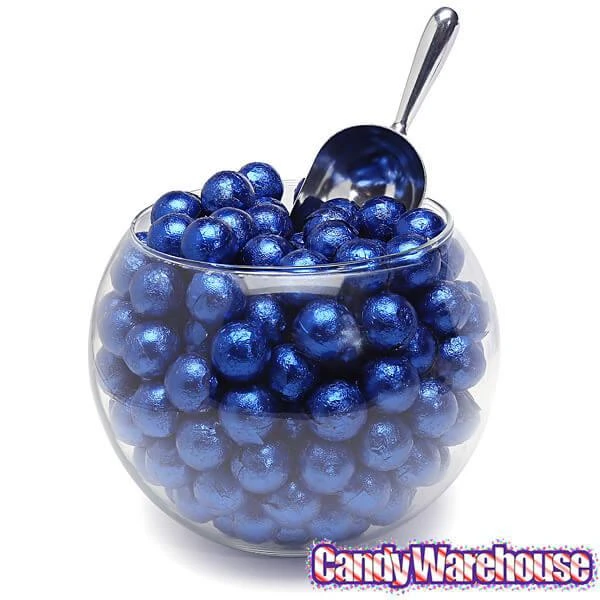 Bag contains 5 pounds of Royal Blue Foiled Caramel Filled Chocolate Candy Balls.