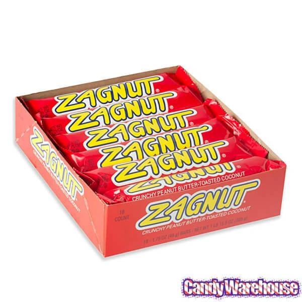 Display box contains 18 Zagnut Candy Bars, each with a net weight of 1.75 ounces.